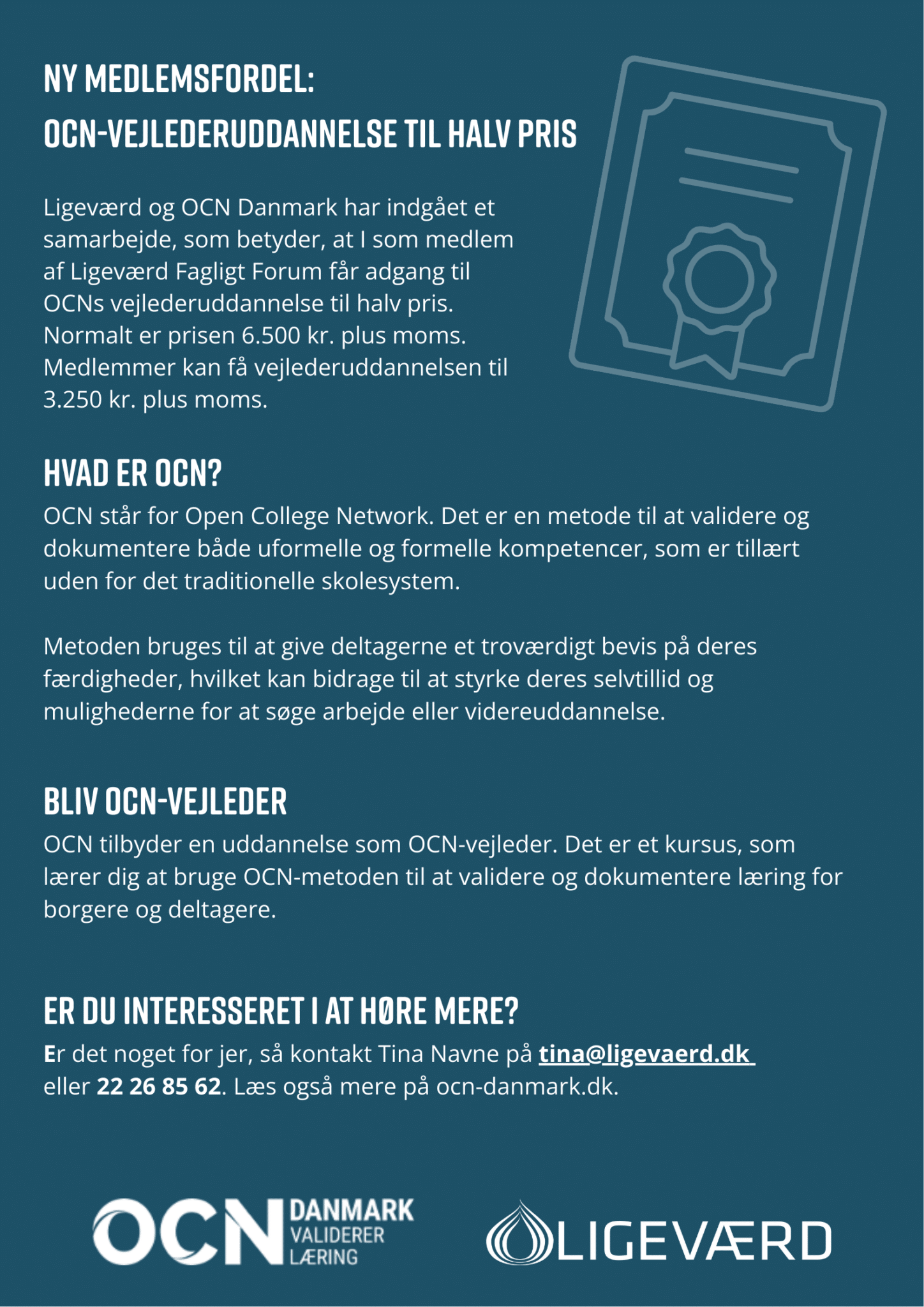 Ligeværd og OCN Danmark har indgået et samarbejde, som betyder, at I som medlem af Ligeværd Fagligt Forum får adgang til OCNs vejlederuddannelse til halv pris. Normalt er prisen 6.500 kr. plus moms.